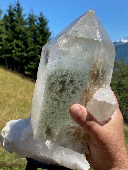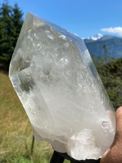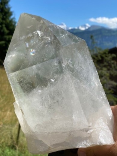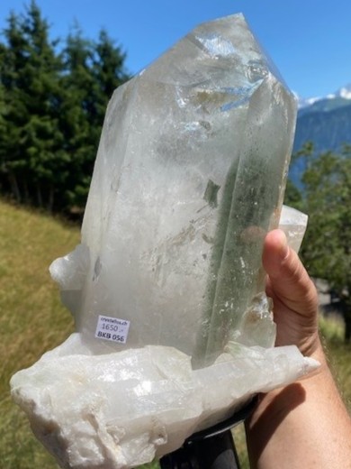 Diese imposante Bergkristall – Spitze erreicht vertikal aufgestellt eine Länge von 25 cm. Interessantes Innenleben zum Teil mit grünem Chlorit. Schöne Spitze von guter Qualität und schönem Glanz. Nicht nachgeschliffen und nachpoliert wie in Brasilien immer öfter üblich. Grösse: 180 x 220 x 185 mm; Gewicht: 5.9 Kg; Fundort: Bahia, Minas Gerais, Brasilien.