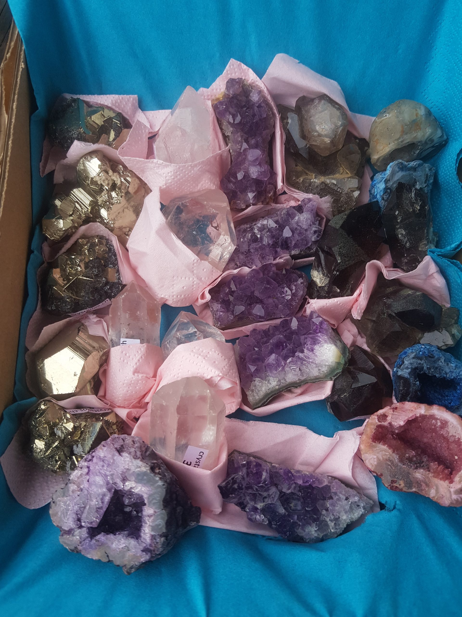 BOX bestehend aus: 5 Bergkristallen, 5 Amethysten, 5 Rauchquarzen, 5 Pyriten, 5 gefärbten Achatgeoden in Kartonbox; Artikel Nr.: BOX-2